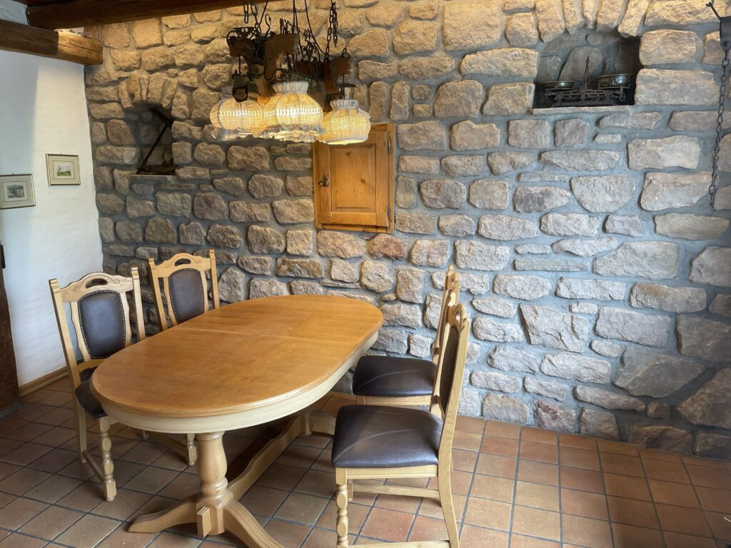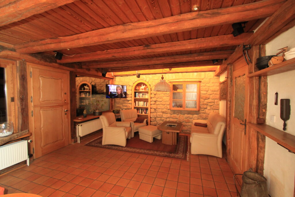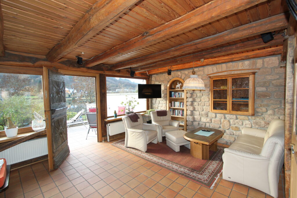 Unser Erdgeschoss erfüllt auch gehobene Ansprüche durch hochwertige Ausstattung und eine besonders wertvolle Einrichtung. Zu der Etage gehört die Sonnenterrasse die Sie durch die historische ‚Klöntür‘ vom Wohnzimmer aus erreichen. Die Terrasse ist gross genug zum sonnenbaden, essen und grillen – die Terrasse hat einen besonders schönen Ausblick. Das Wohnzimmer hat 2 grosse Panoramafenster zur Mosel und die Weinberge und ist dadurch schön hell (Aussenrollo sowie elektrische Markise vorhanden). Neben der kleinen Sitzgelegenheit in der voll ausgestatteten Küche dient die grosse Esstischgruppe in massiver Eiche als Essgelegenheit im Wohnzimmer. Musik oder Videofreunde werden sich über den neuen Blue Ray Player, den Full-HD Monitor und das hochwertige BOSE 7.1 Soundsystem freuen. Diese geschmackvolle Ferienwohnung wird Sommer wie Winter all jene verführen, die eine hochwertige, natürliche Umgebung schätzen und sich in unserem Wellnessbereich erholen und entspannen möchten.