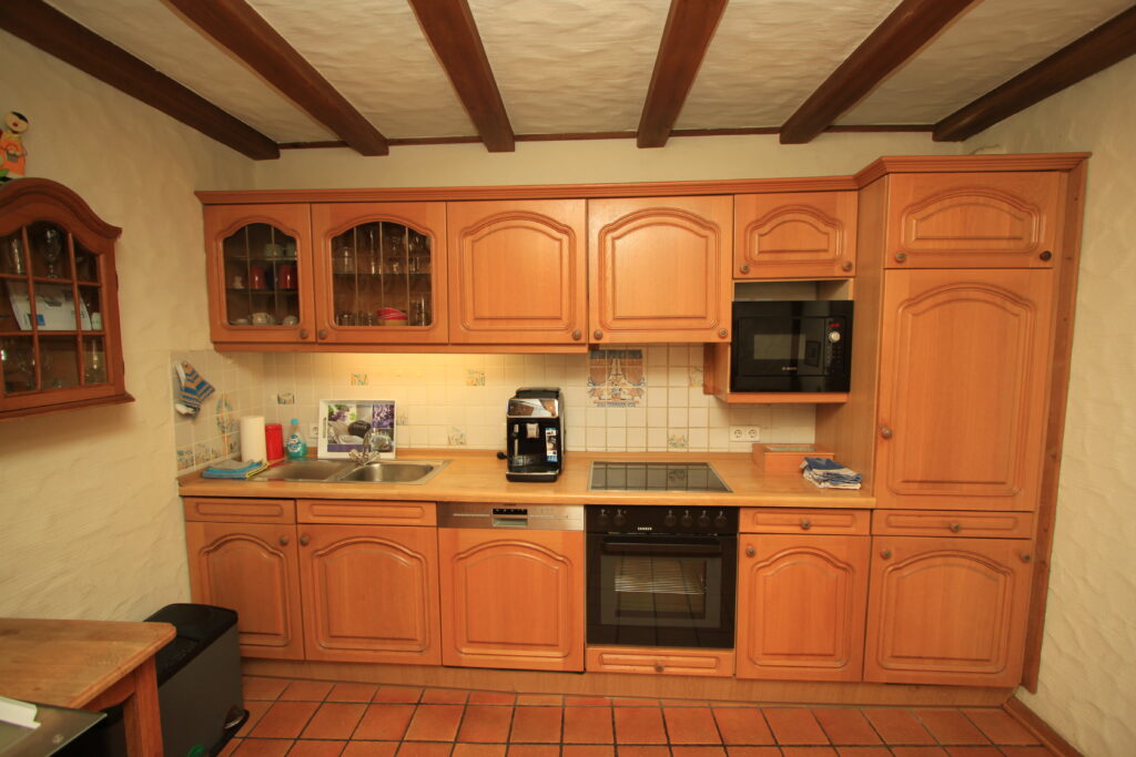 Auch hier fällt die individuelle Verarbeitung von zum Teil antiken Echtholzelementen ins Auge. Das Badezimmer ist geräumig und hat eine Runddusche. Fön, Hand- und Badetücher sowie 2 Bademäntel werden gestellt.